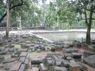 Next was Baphuon (no idea how to pronounce it). It's been deemed by some the world's largest jigsaw puzzle. A French restoration team started disassembling the temple to clean and restore it before the Khmer Rouge took over. When the Khmer Rouge made it too dangerous to continue, the team left and their notes and plans were destroyed. The temple couldn't be fully reconstructed. There are still blocks lying all around.
